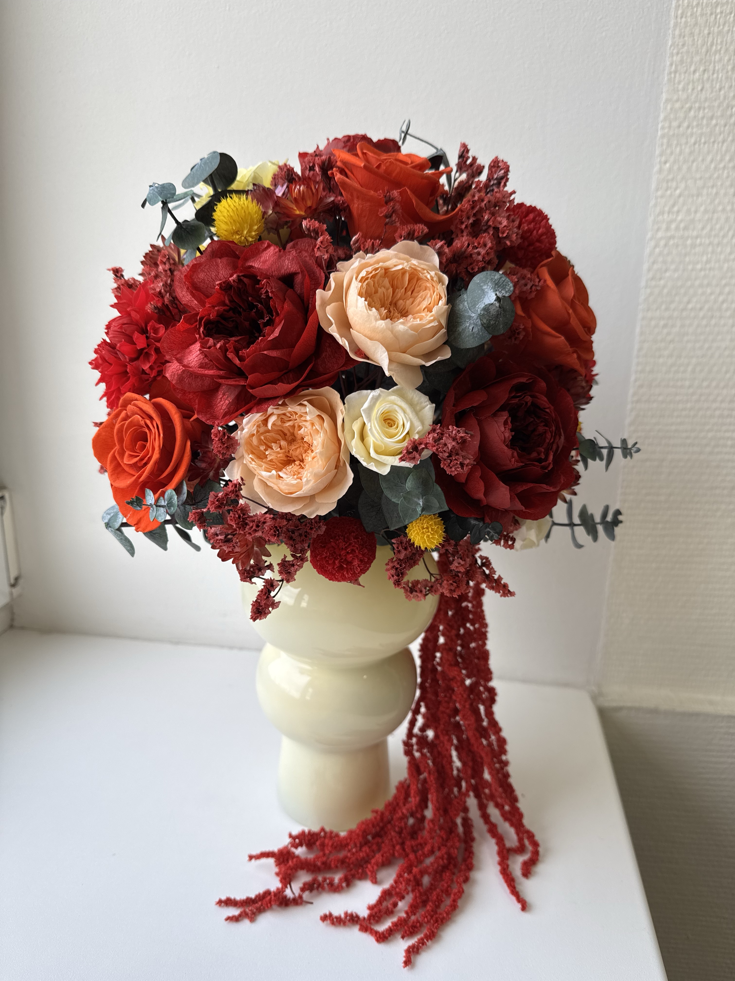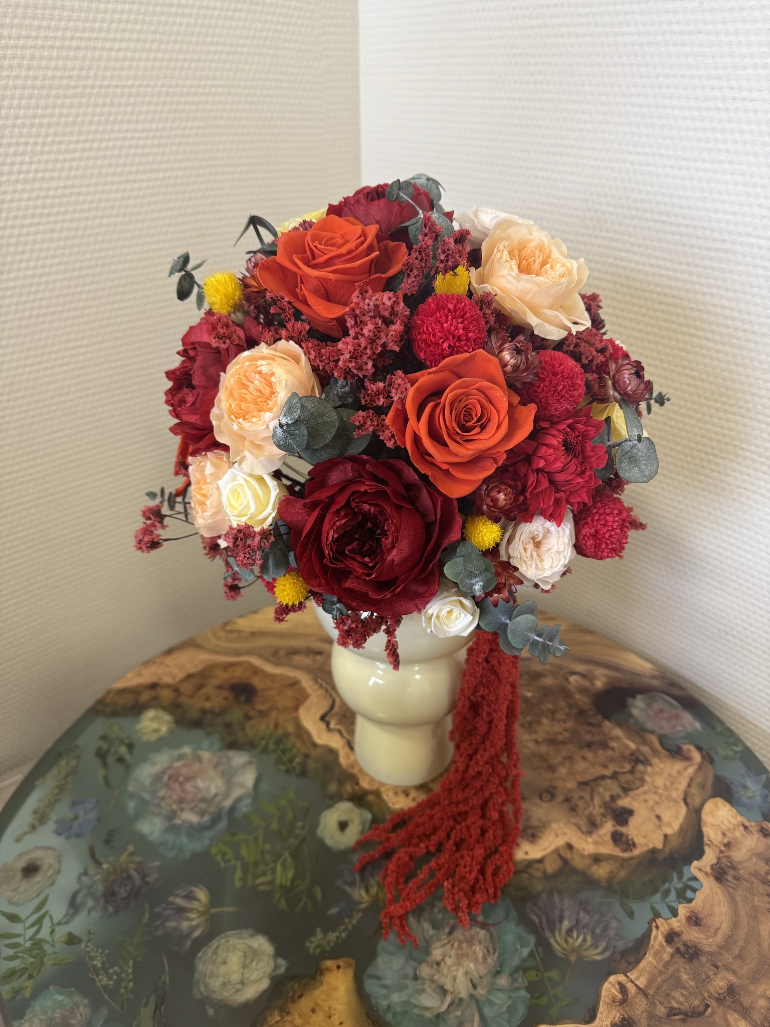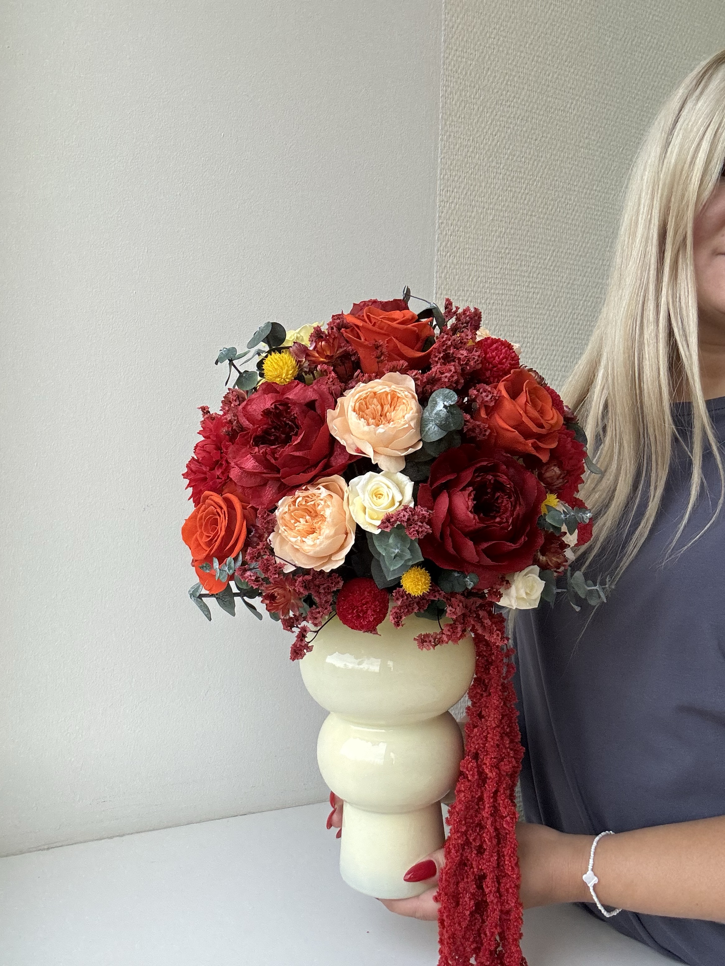 Таким цветам не требуется вода и специального ухода, композиция прослужит не один год.