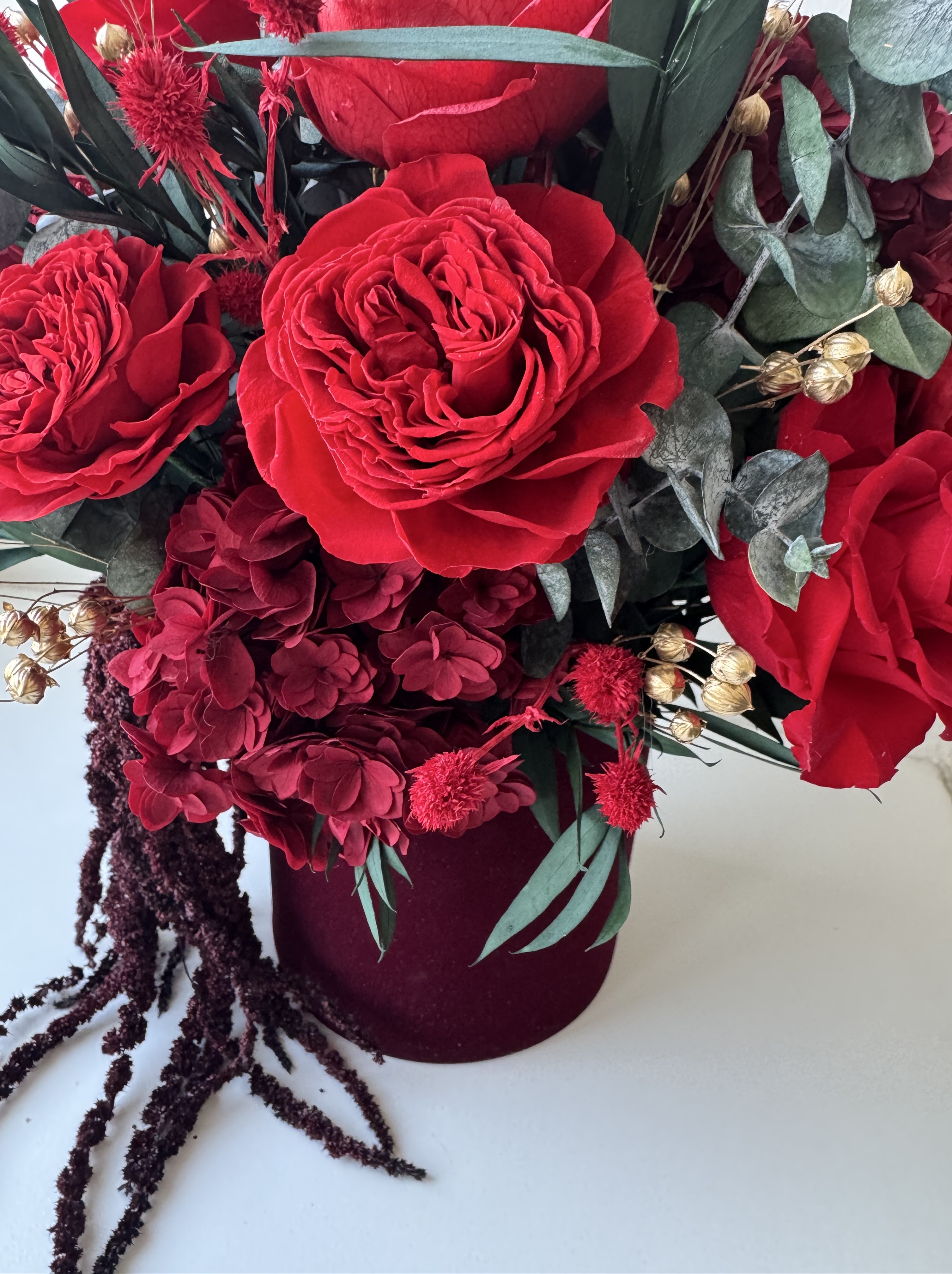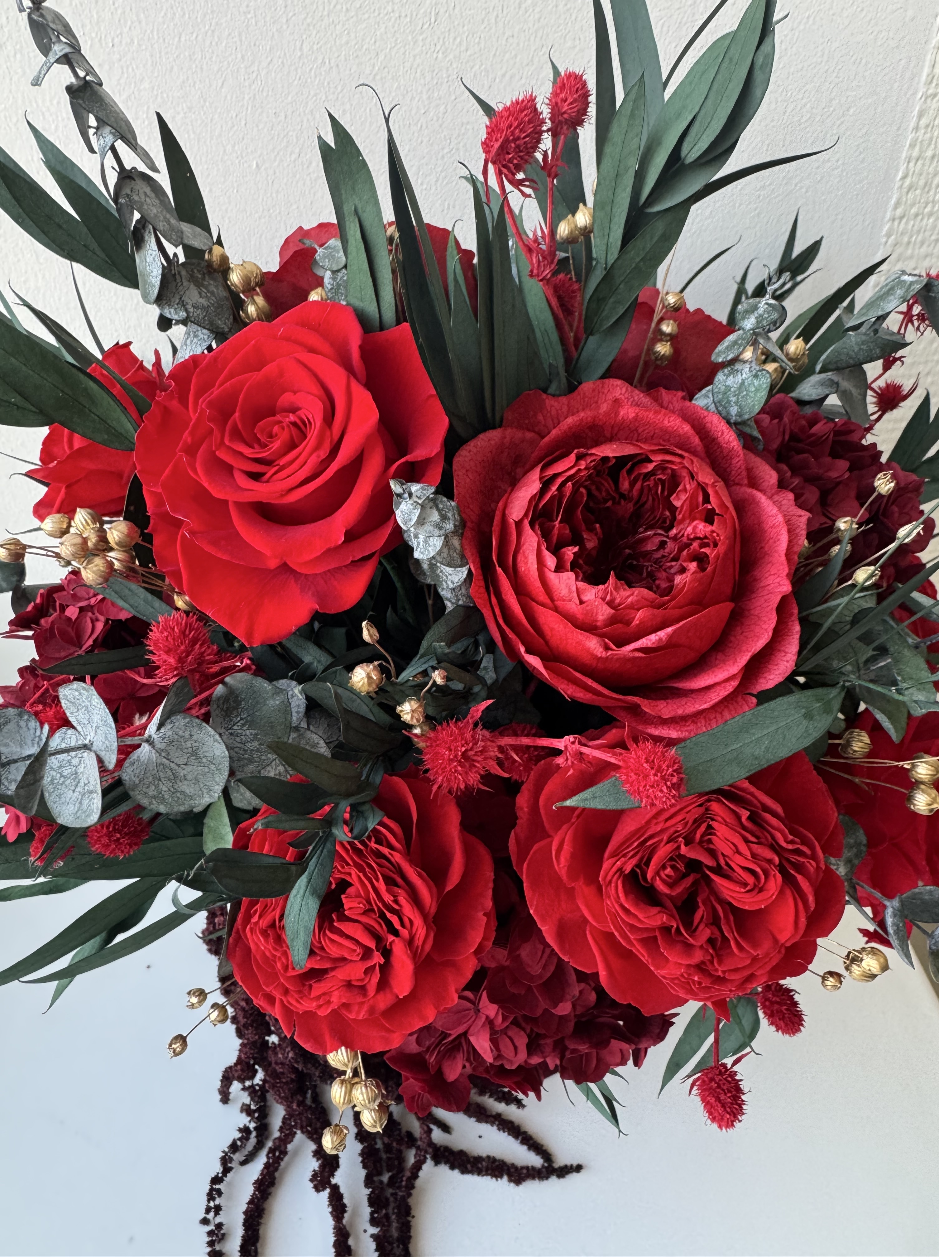 Интерьерная композиция выполнена из стабилизированных растений и сухоцветов.