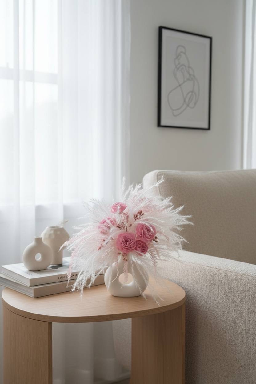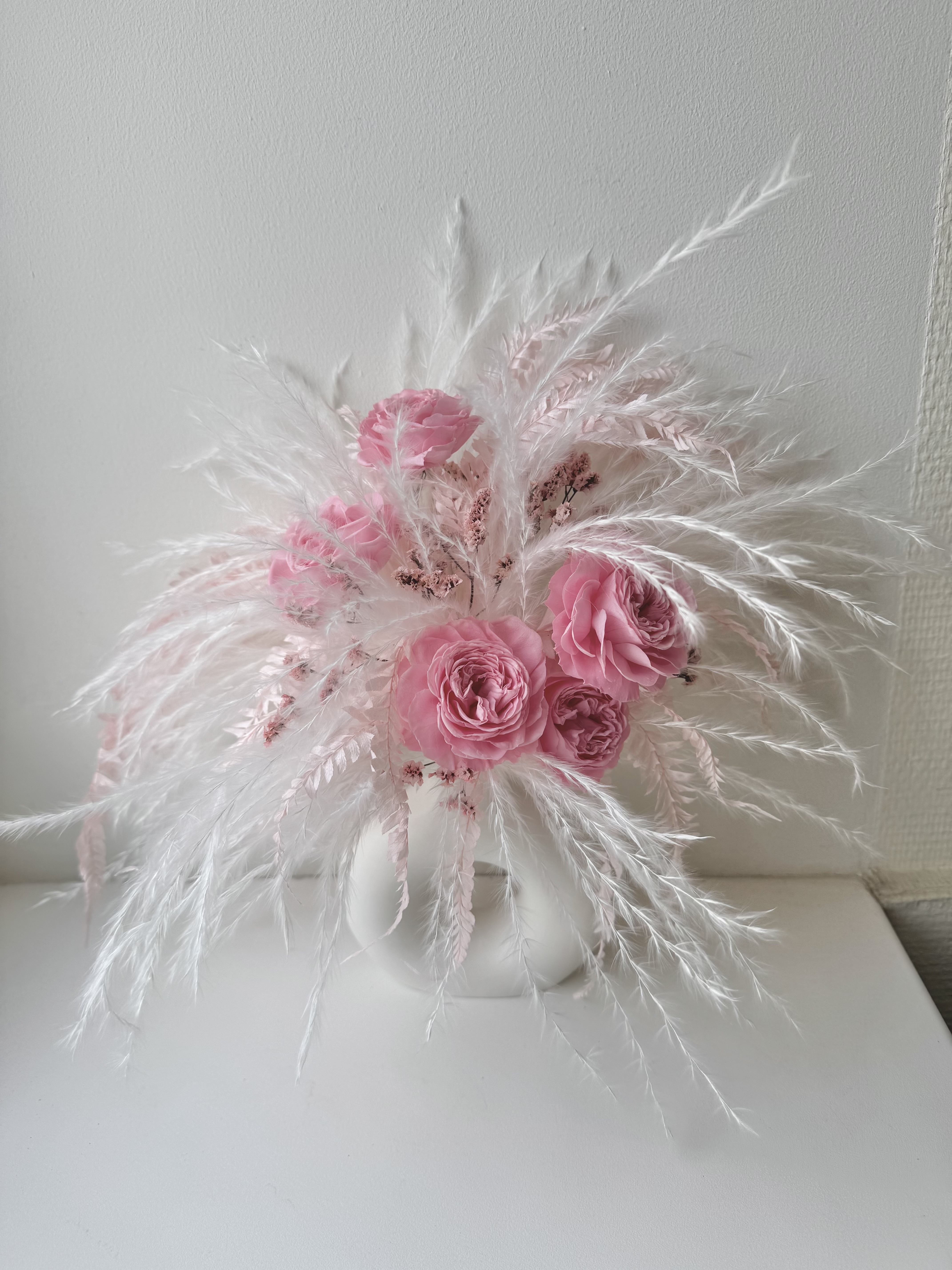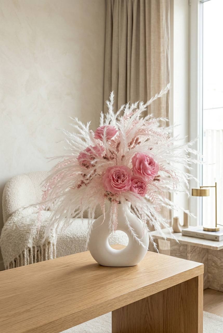 Интерьерная композиция выполнена из стабилизированных растений и сухоцветов.