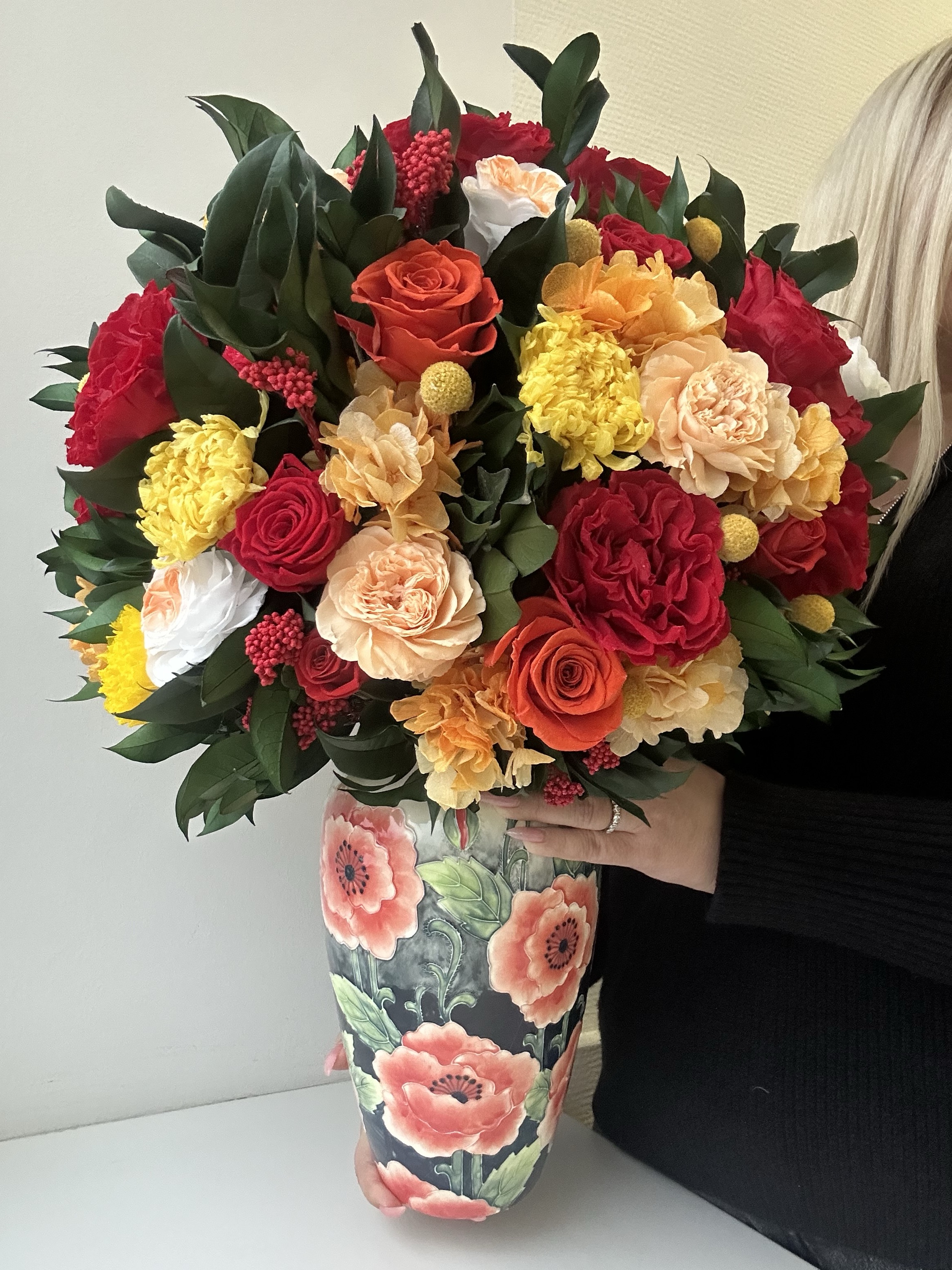 Таким цветам не требуется вода и специального ухода, композиция прослужит не один год.