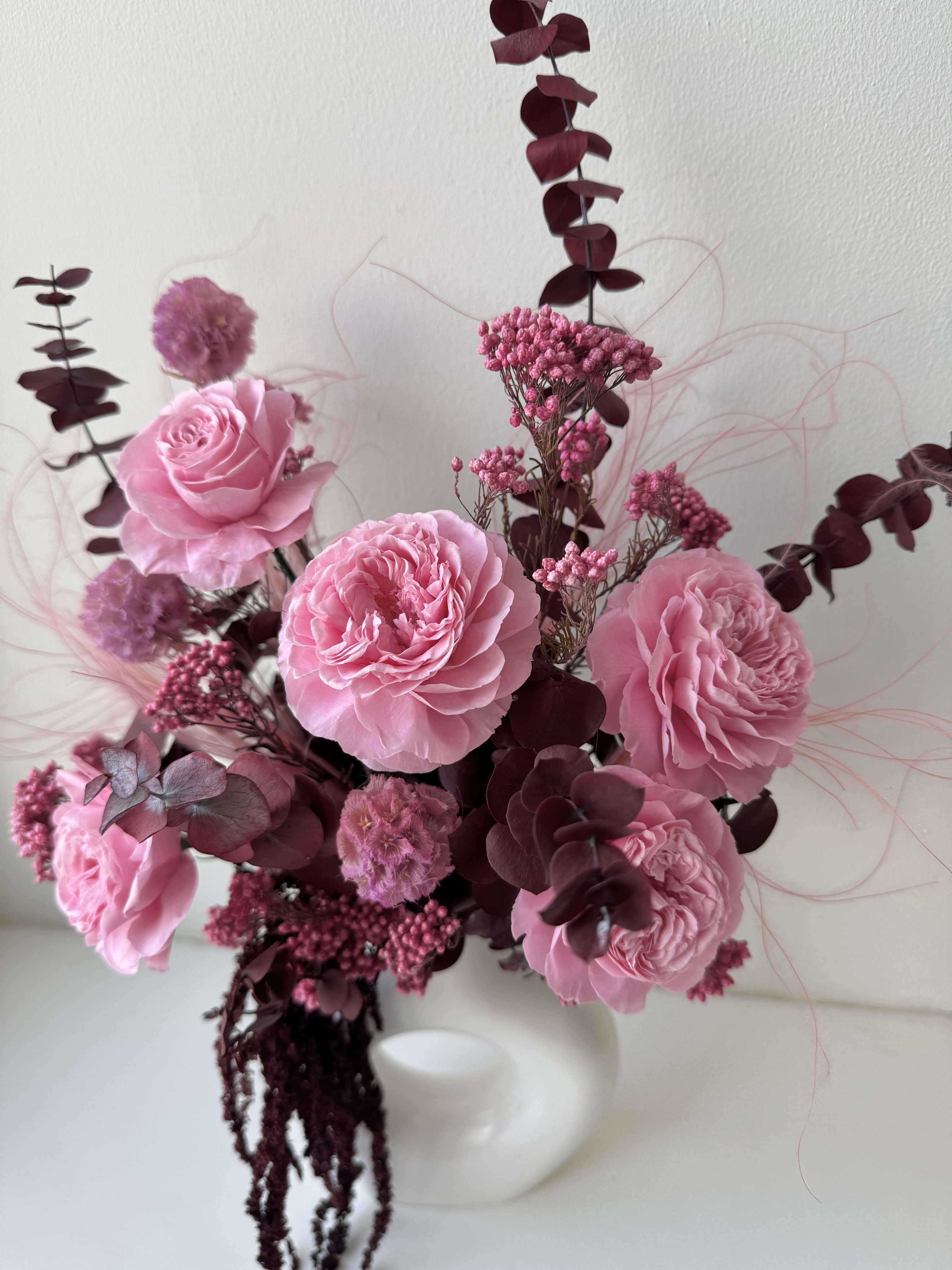 Интерьерная композиция выполнена из стабилизированных растений и сухоцветов.