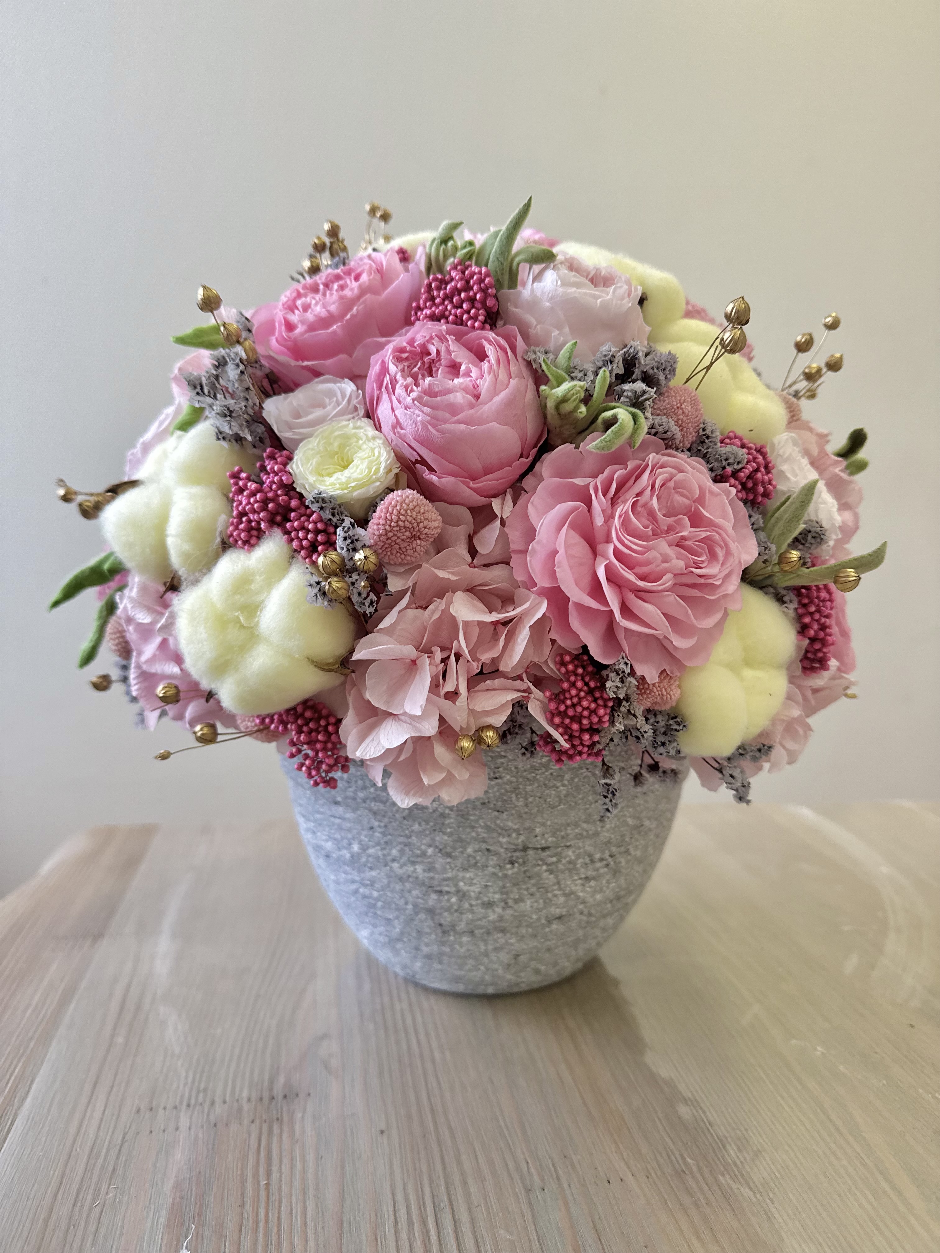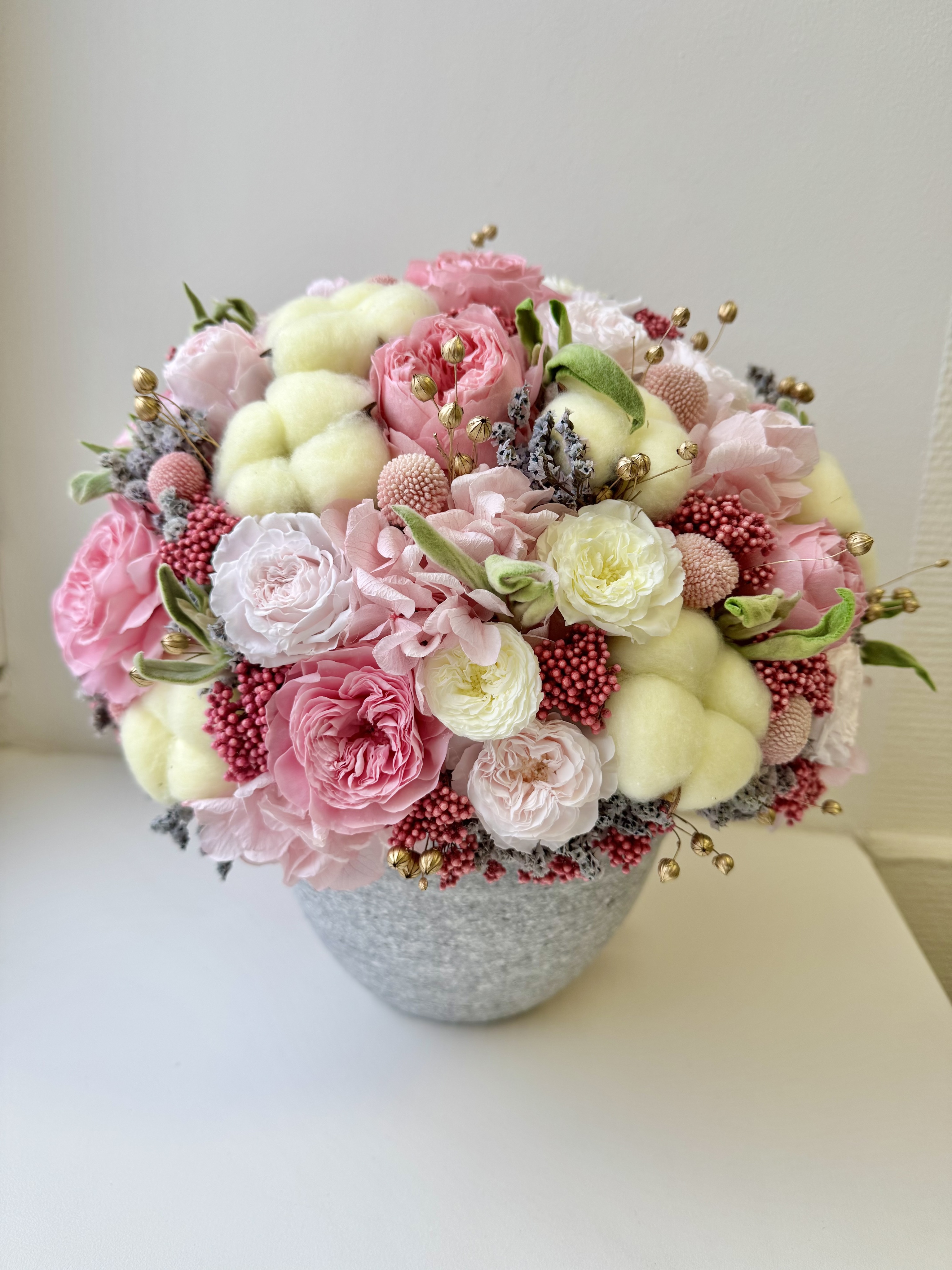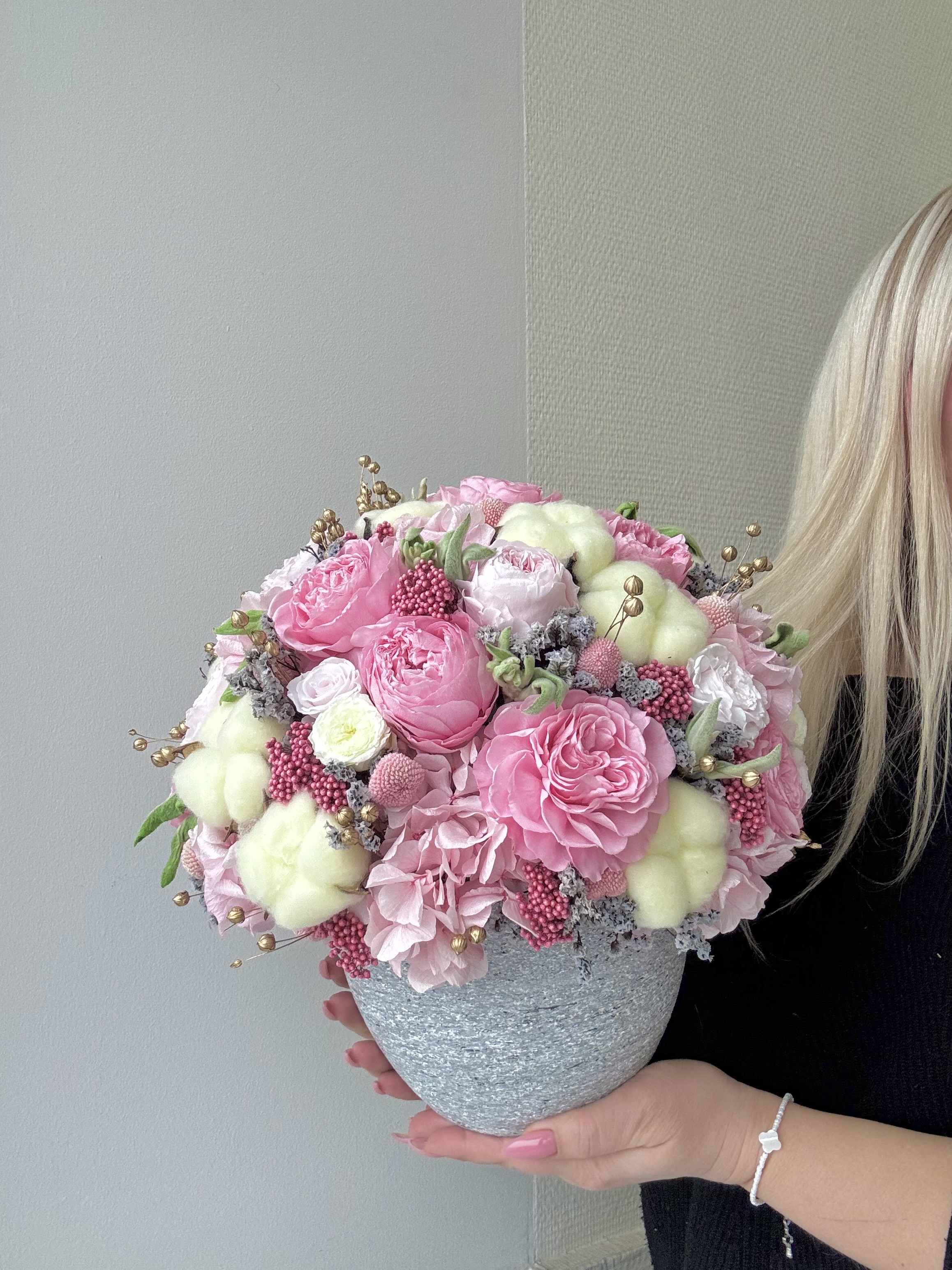 Таким цветам не требуется вода и специального ухода, композиция прослужит не один год.