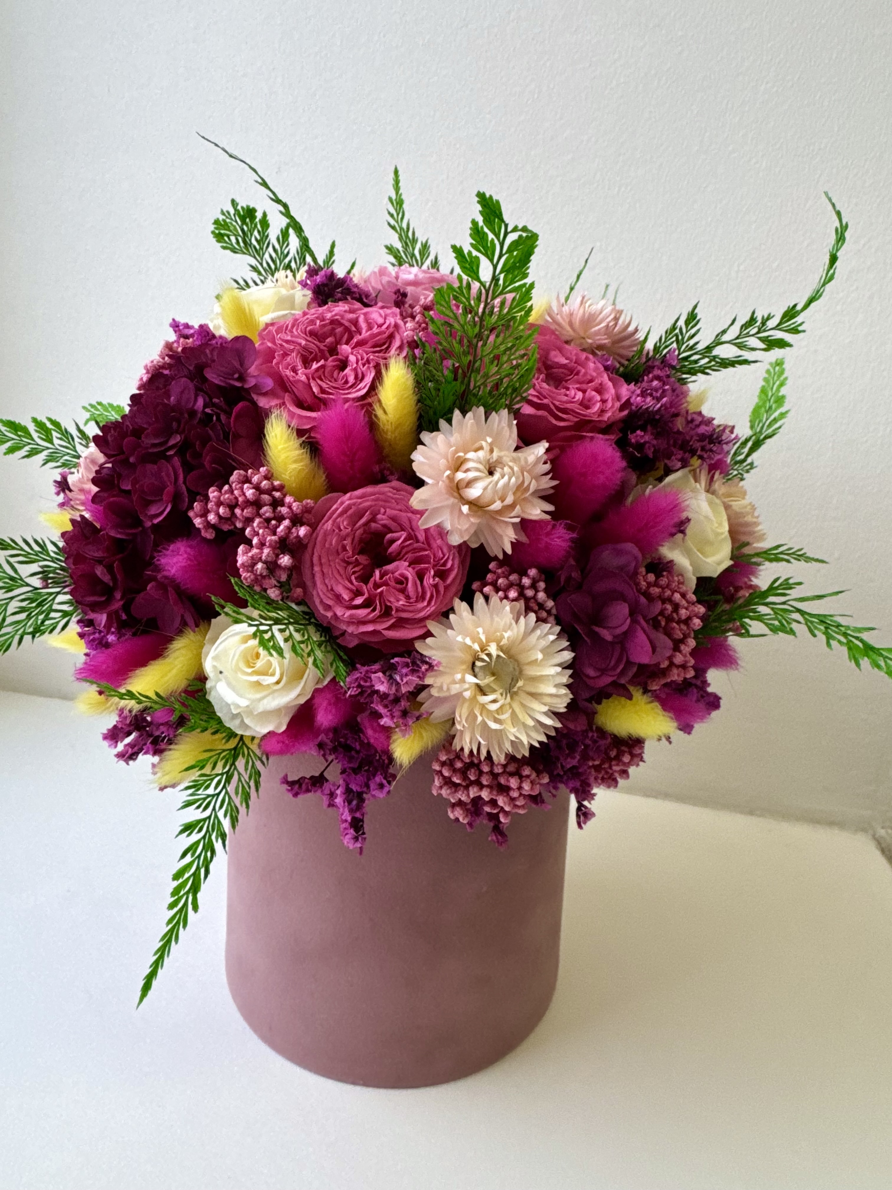 Интерьерная композиция выполнена из стабилизированных растений и сухоцветов.