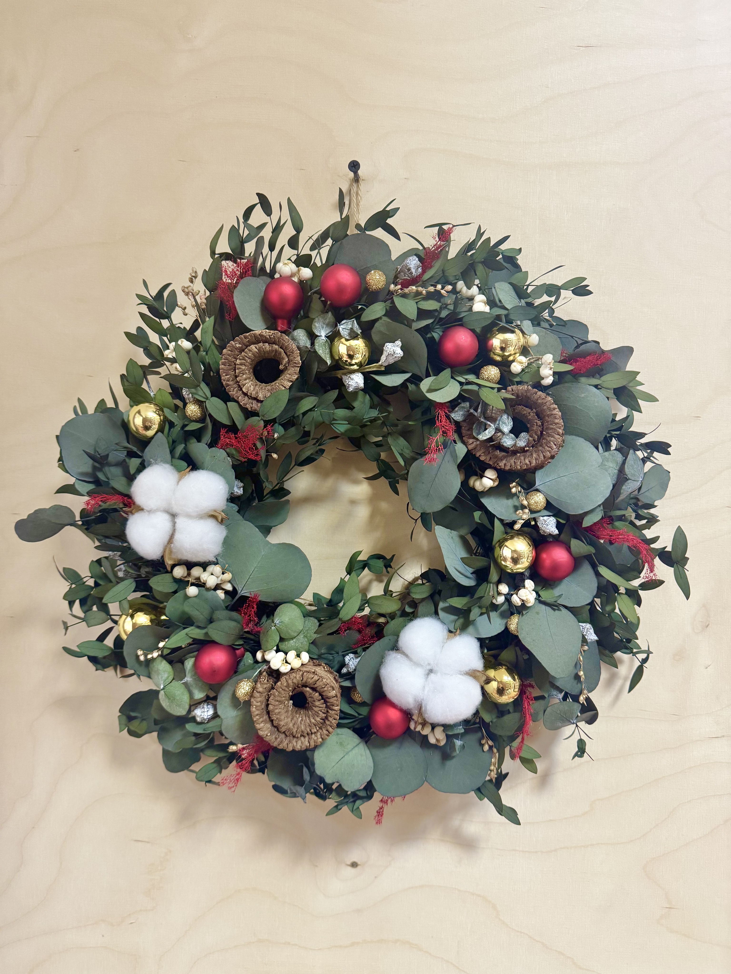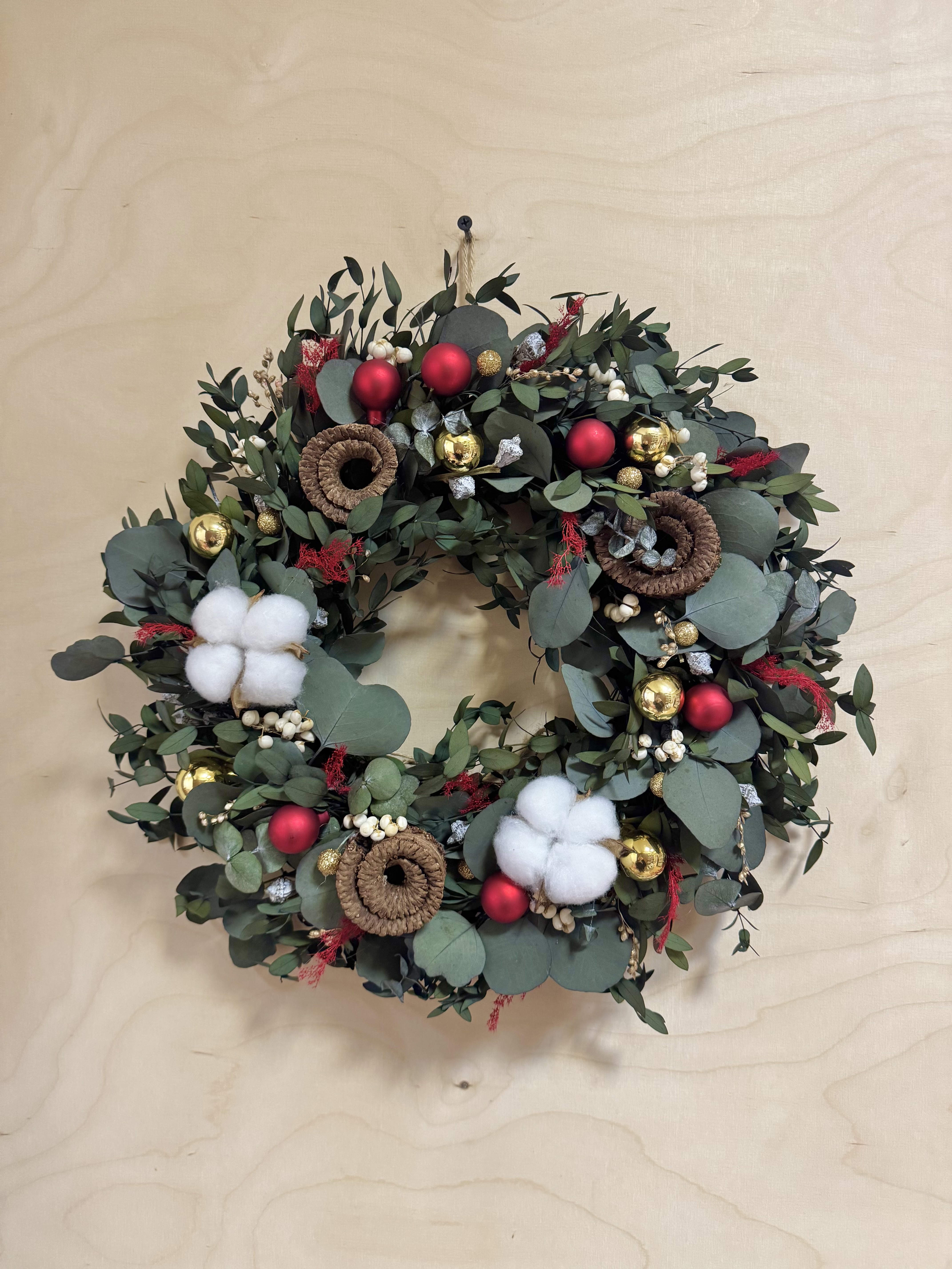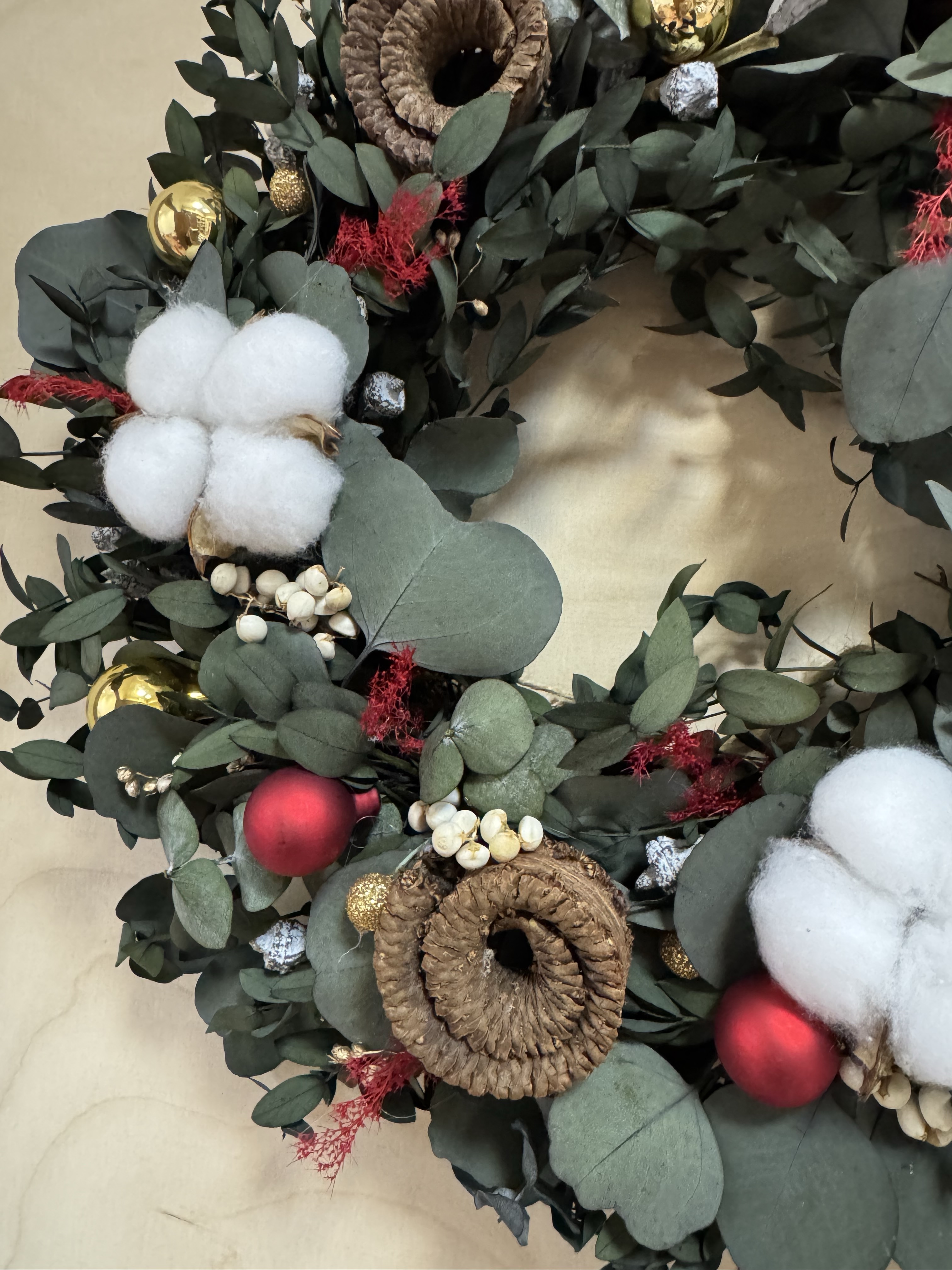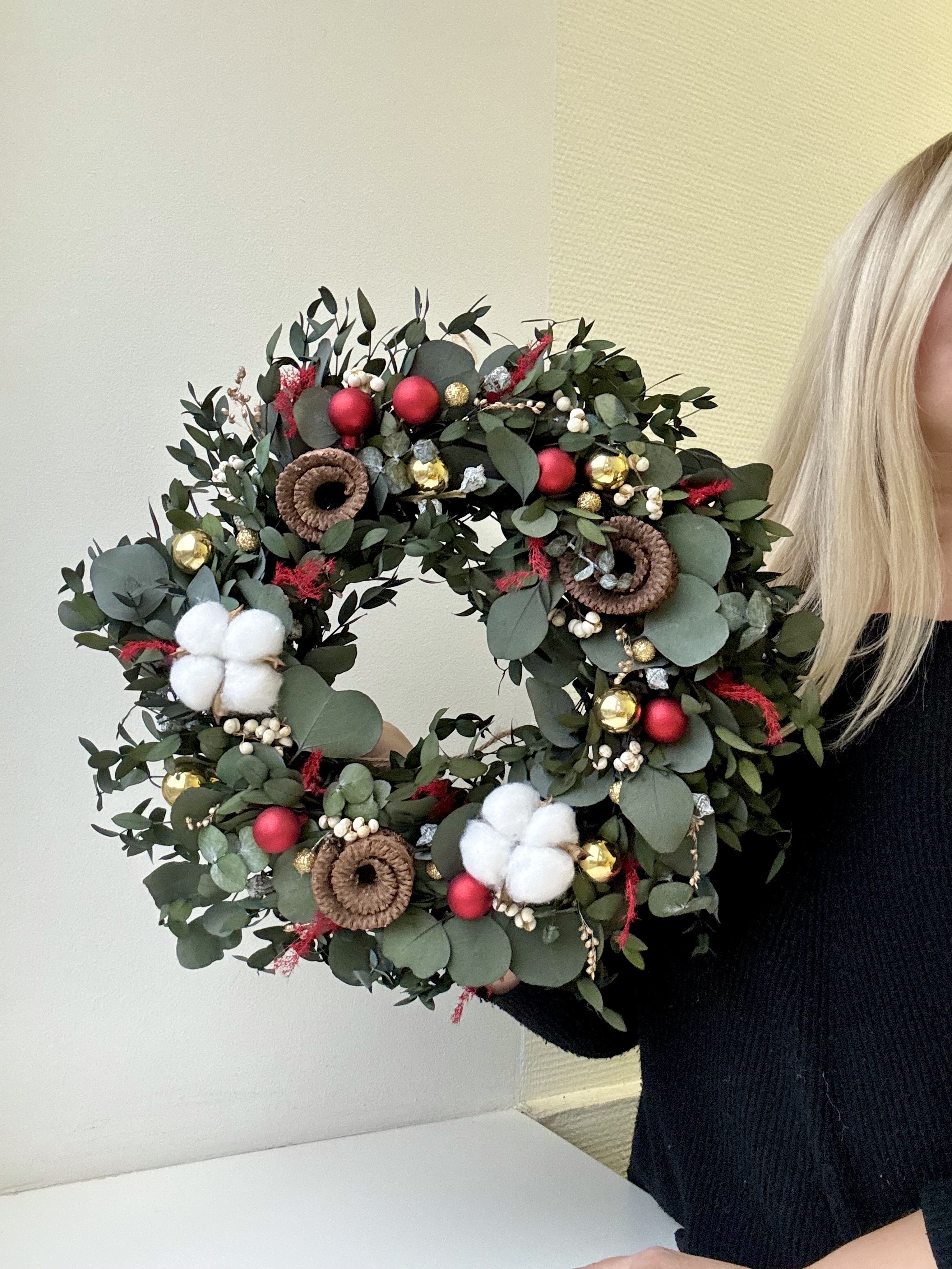 Интерьерный венок выполнен из стабилизированных растений и сухоцветов.