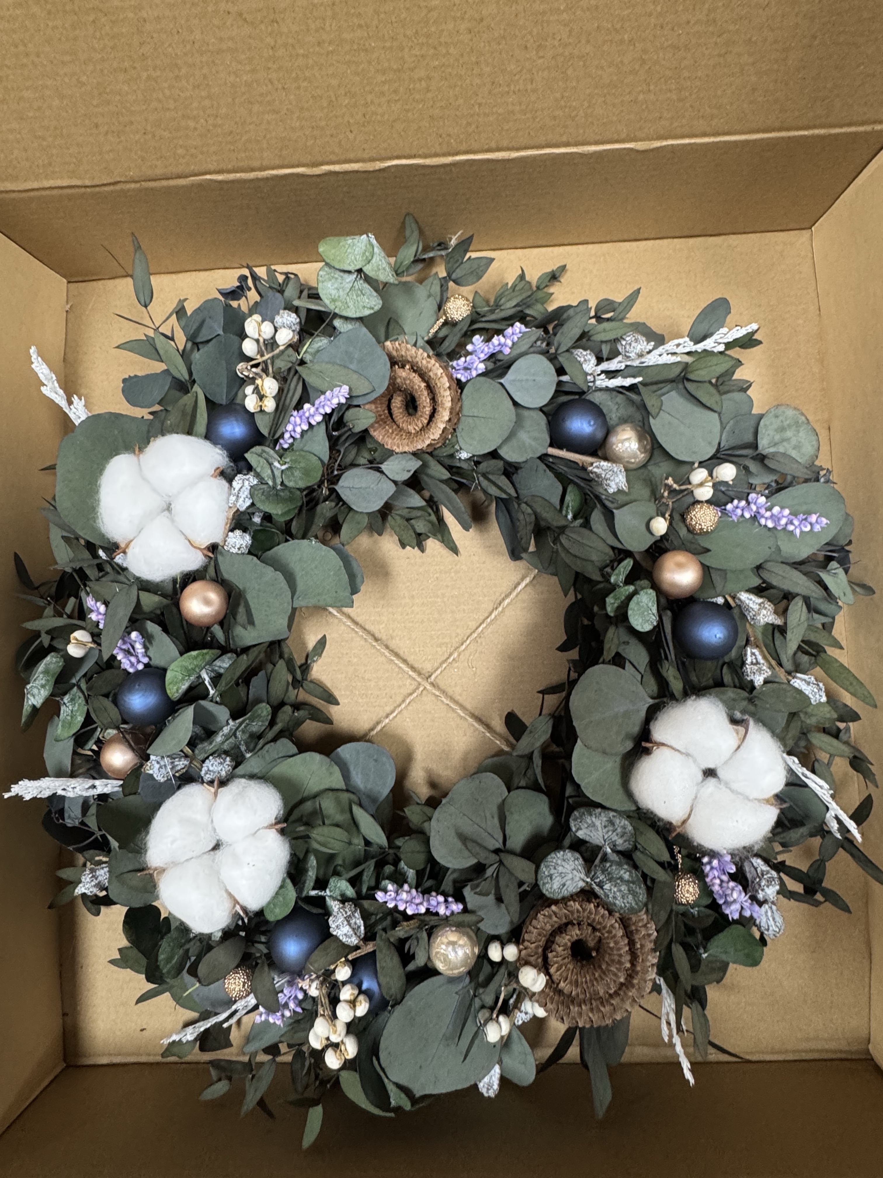 Интерьерный венок выполнен из стабилизированных растений и сухоцветов.