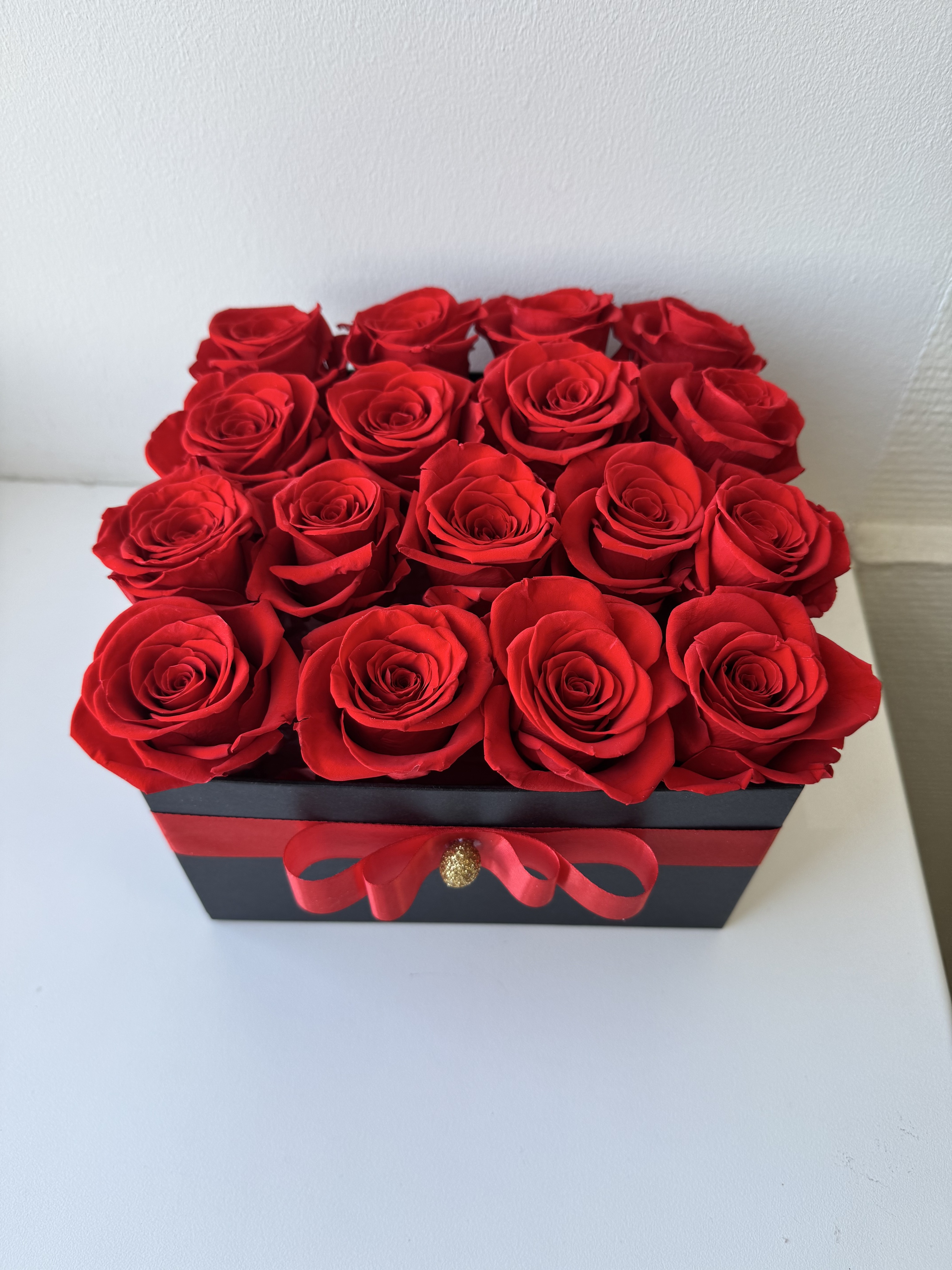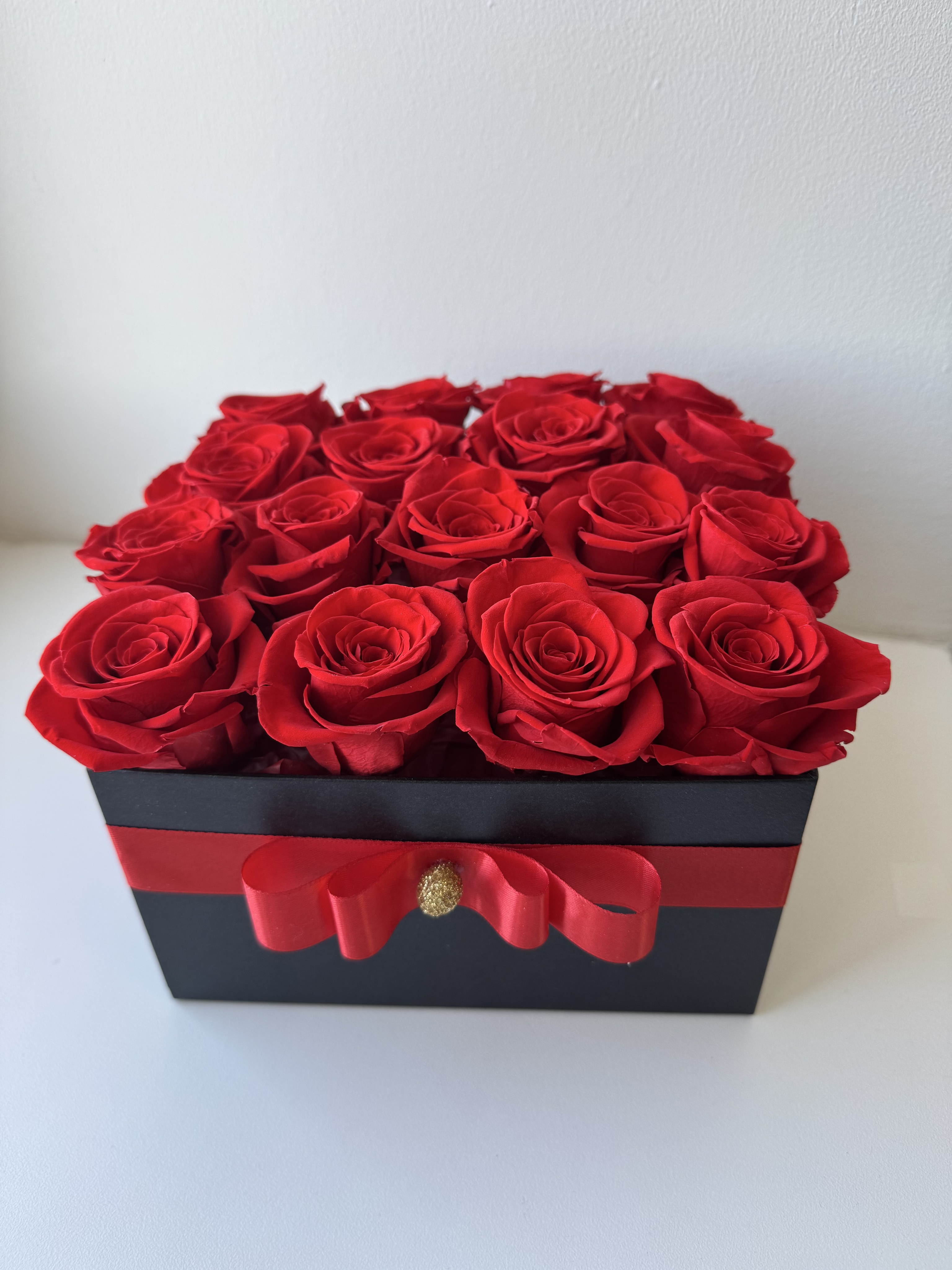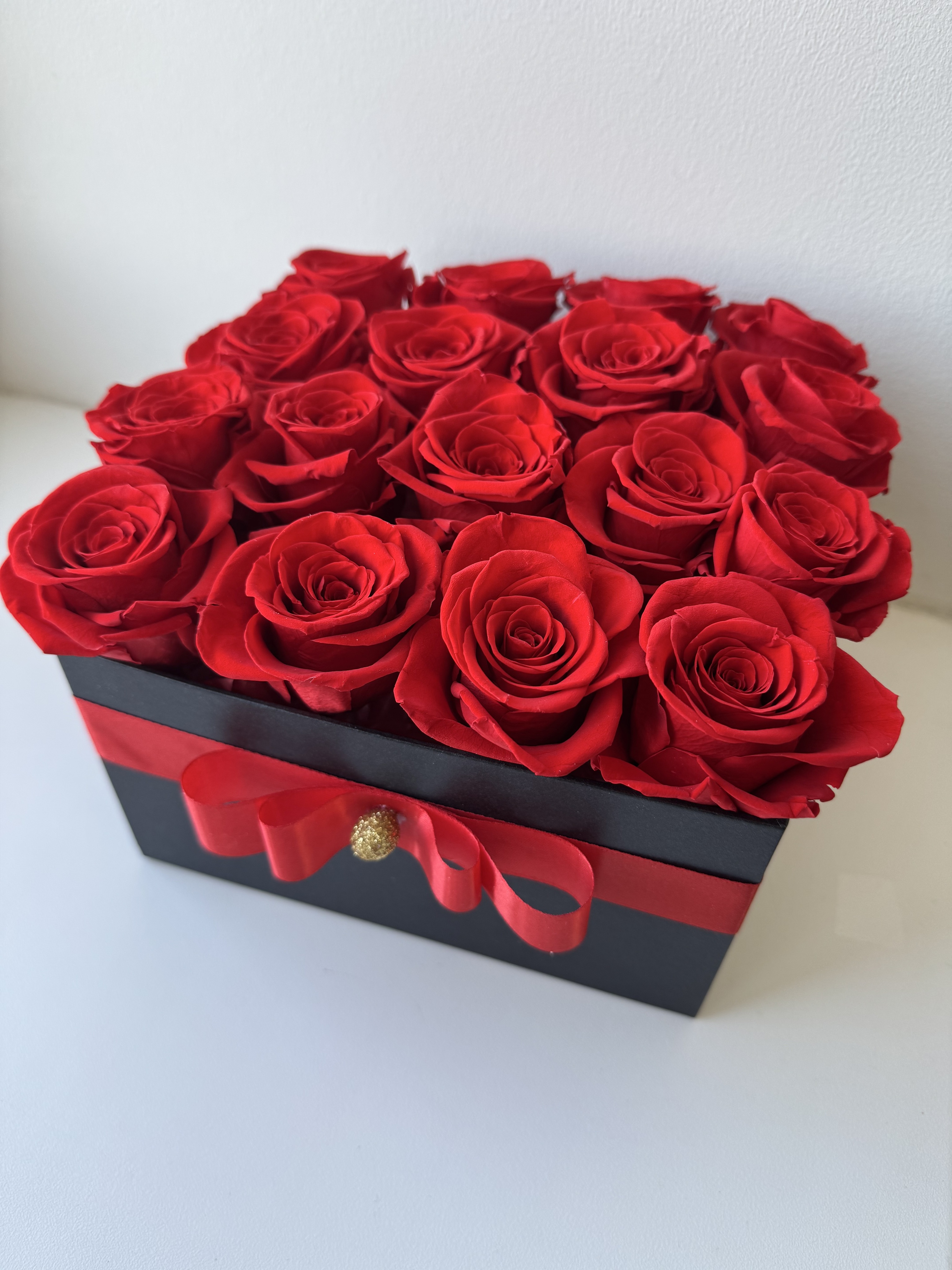 Интерьерная композиция выполнена в коробке из 17 стабилизированных роз.